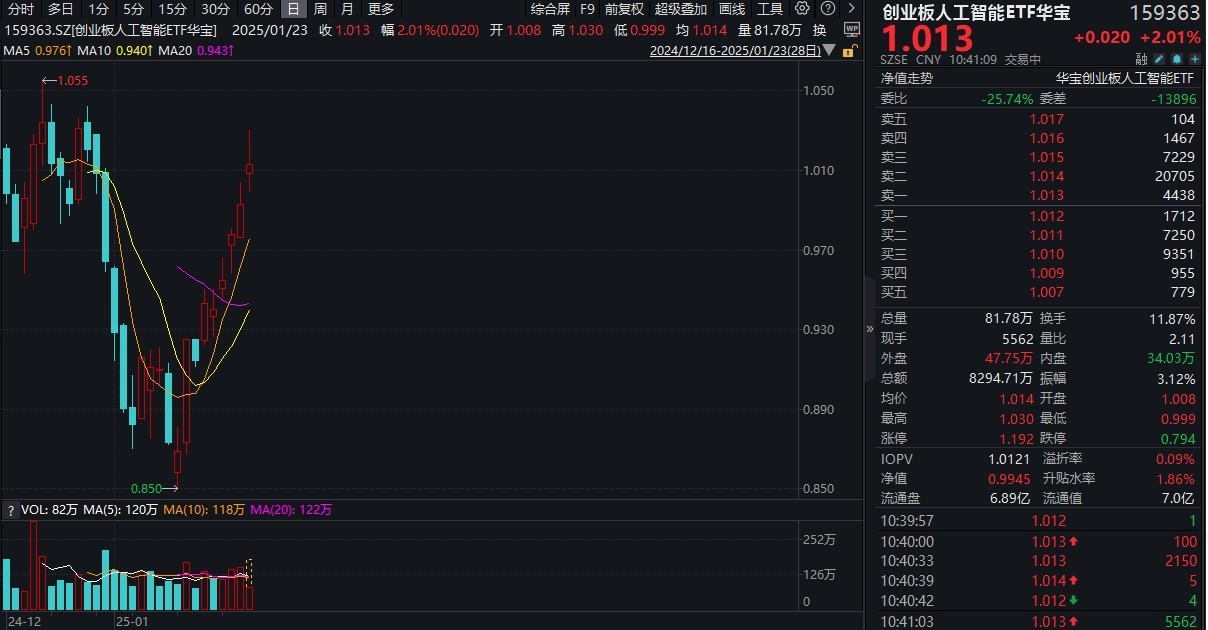 热门ETF方面,全市场首只的创业板人工智能ETF华宝(159363)场内续涨2%,冲击日线六连阳!实时成交额超8100万元,换手率超11%,交投持续火热。